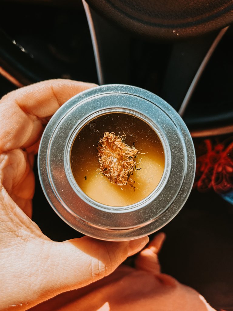 I like to top my salves with a dried dandelion, like the image below: Make sure your dandelion is completely dry before adding to the salve. Let the dandelion salve start to solidify, but not completely before adding the dried dandelion.